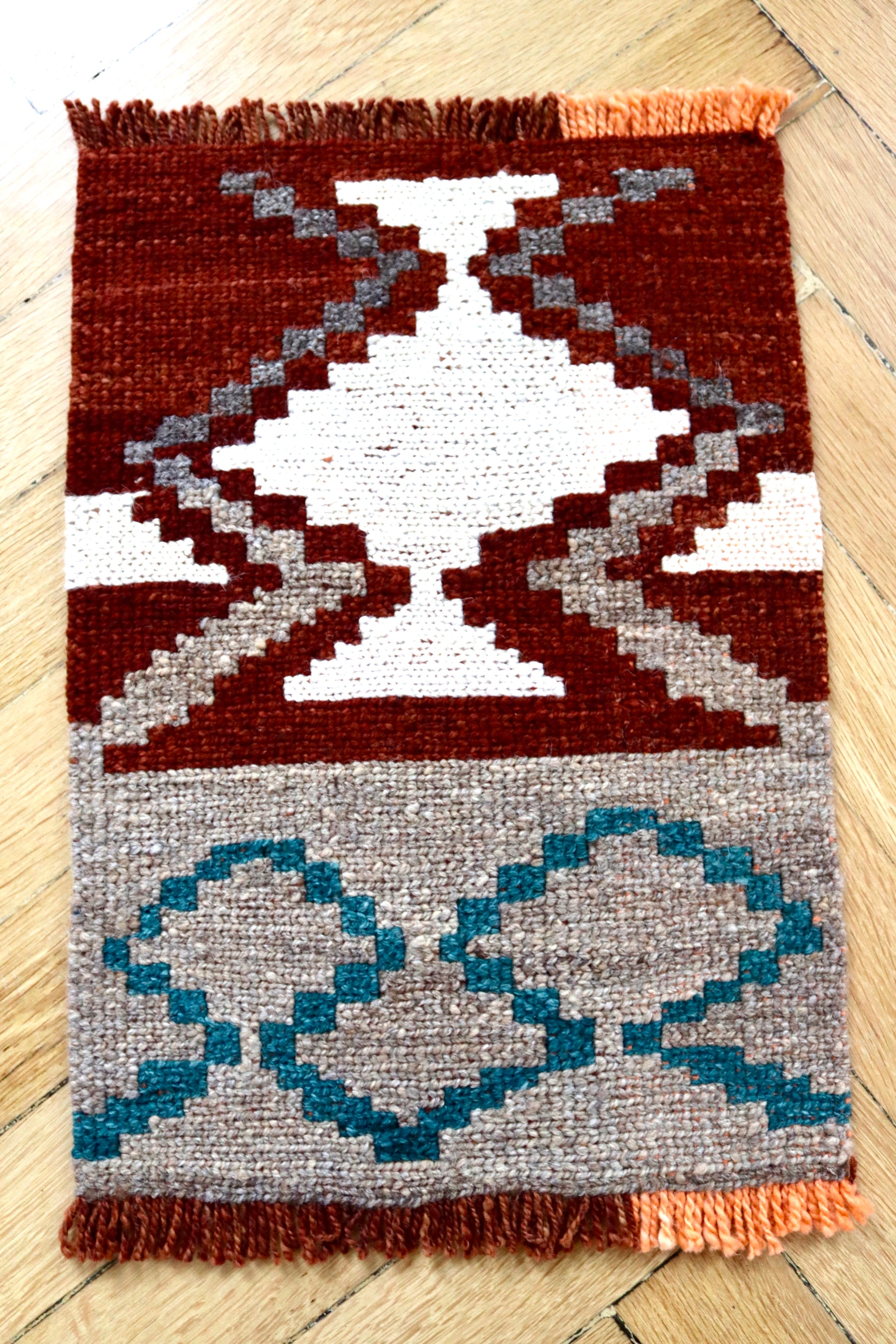 Handwoven tapestry or decoration (e.g. as a placemat, table decoration or doormat) from a women's cooperative of indigenous women from the Qomle'ec community in the Gran Chaco region of northern Argentina.